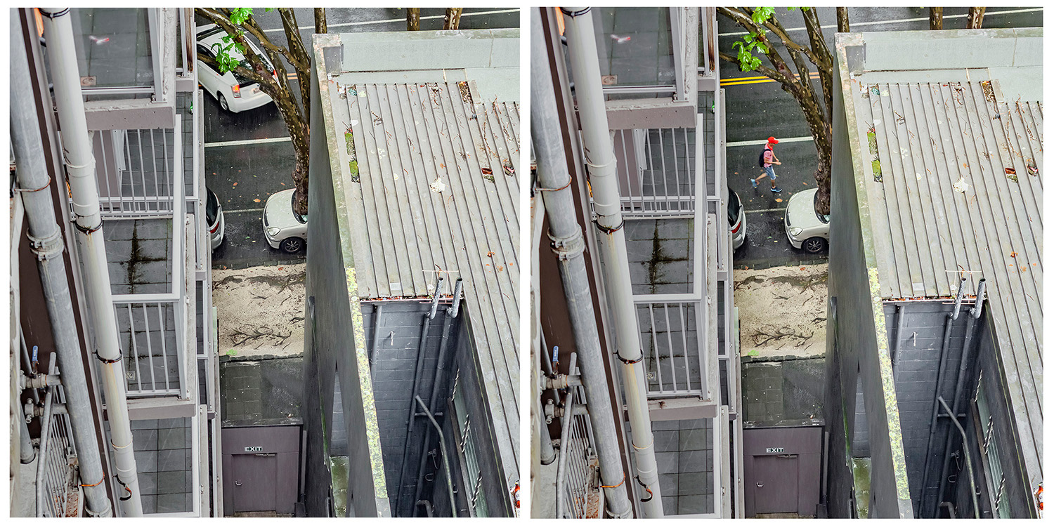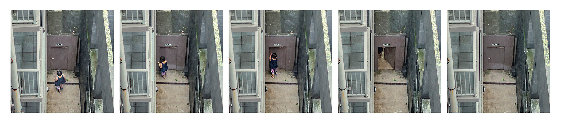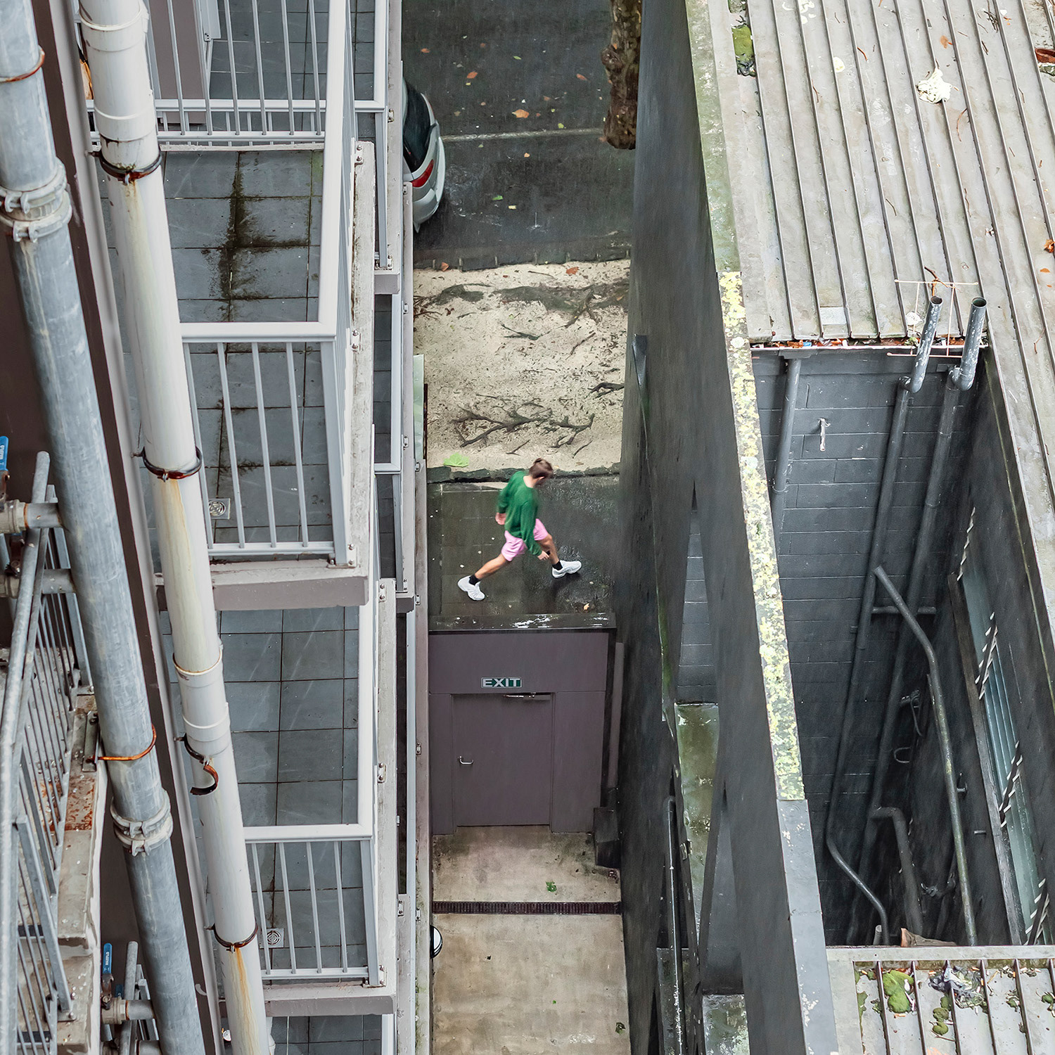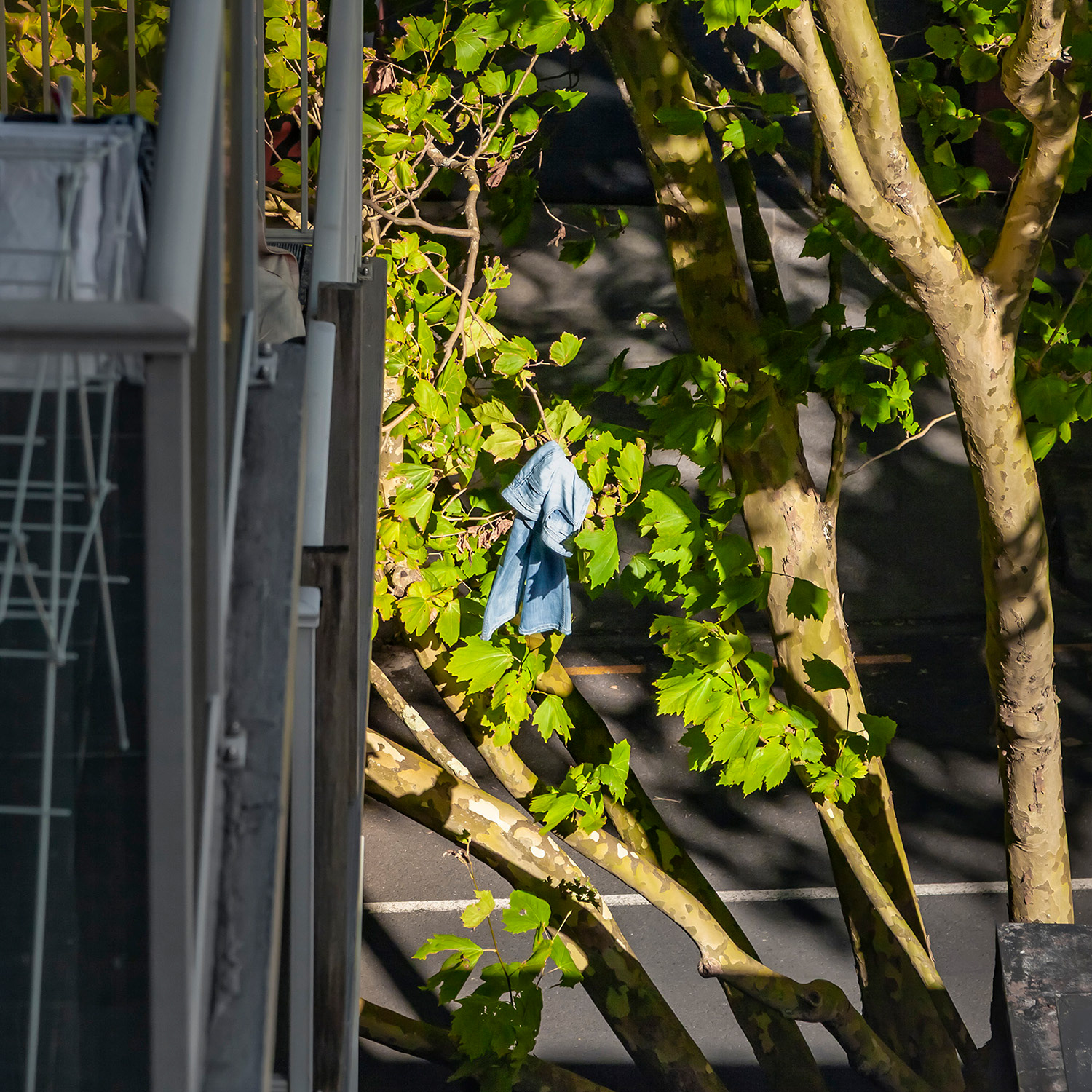 I spent the first month of this three-month break in a studio room of a small apartment in an unfamiliar city. Everything around me felt strange, but it was also exciting and uplifting. During the first week, I spent little time indoors, busy exploring the neighborhood. About two weeks in, I finally began to settle, occasionally sitting blankly on the balcony. It wasn’t a particularly scenic view, but perhaps due to my past work, I had developed the habit of observing the world outside windows. One day, while casually looking around, I noticed a pair of jeans caught in a tree—blown there by the wind. It was a curious sight, not something one sees every day. As I continued to observe and record it, I began noticing people hurrying through the narrow gap between two buildings below. Boredom and the anticipation of seeing who might appear next kept me watching.