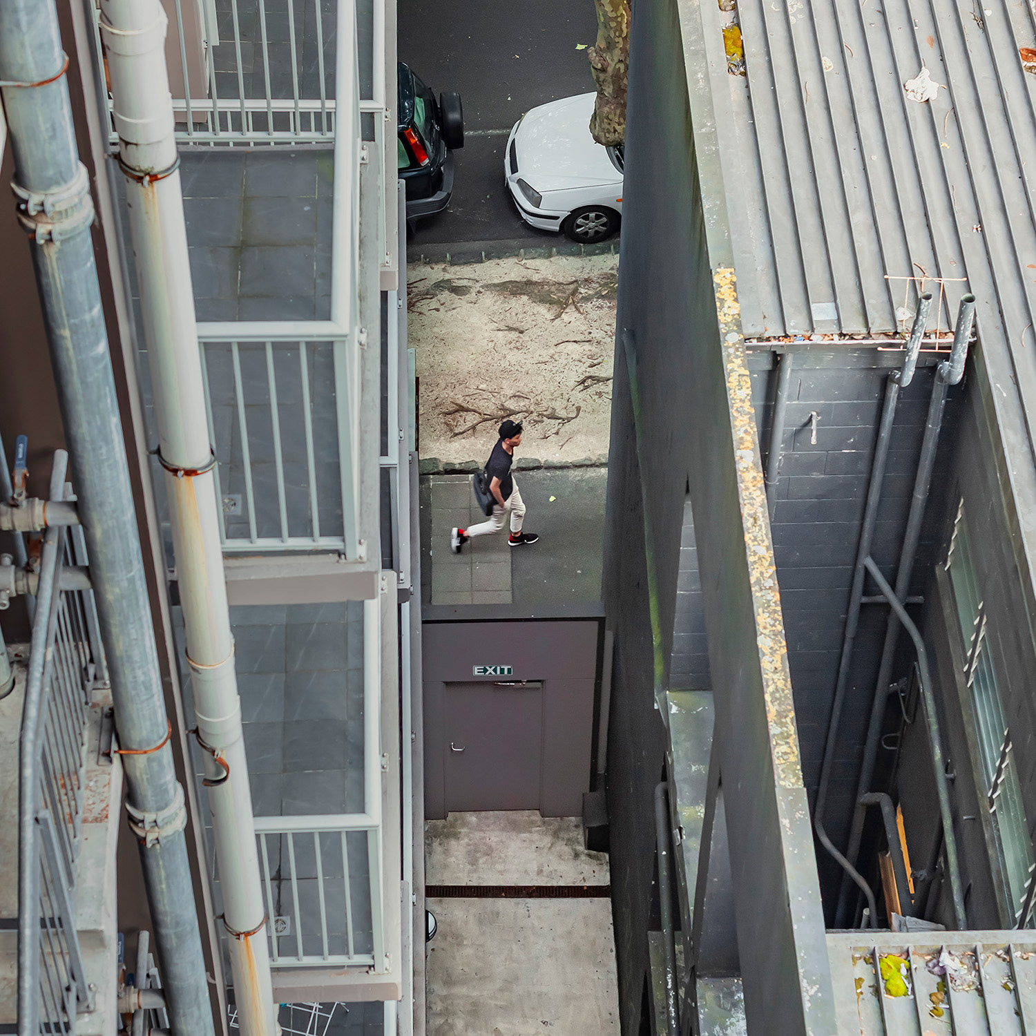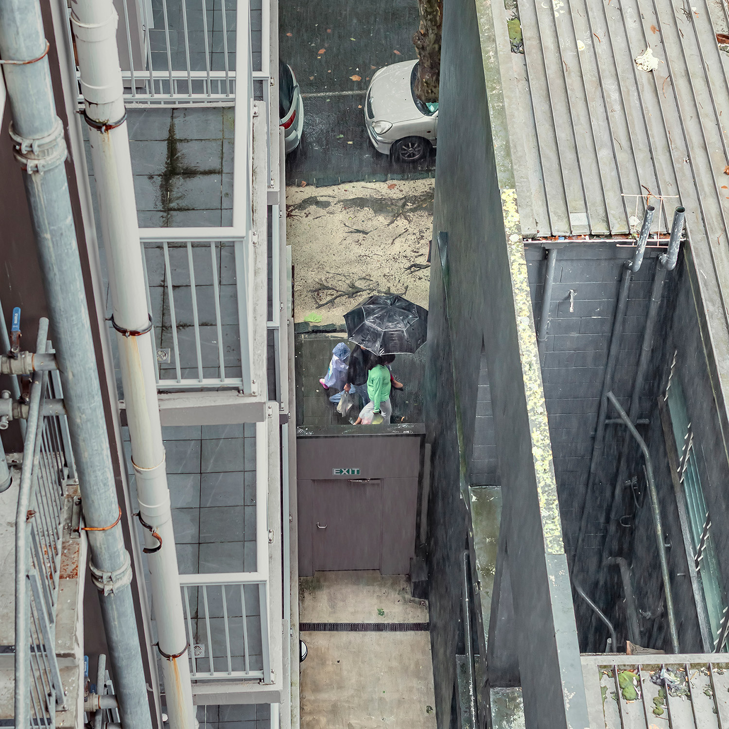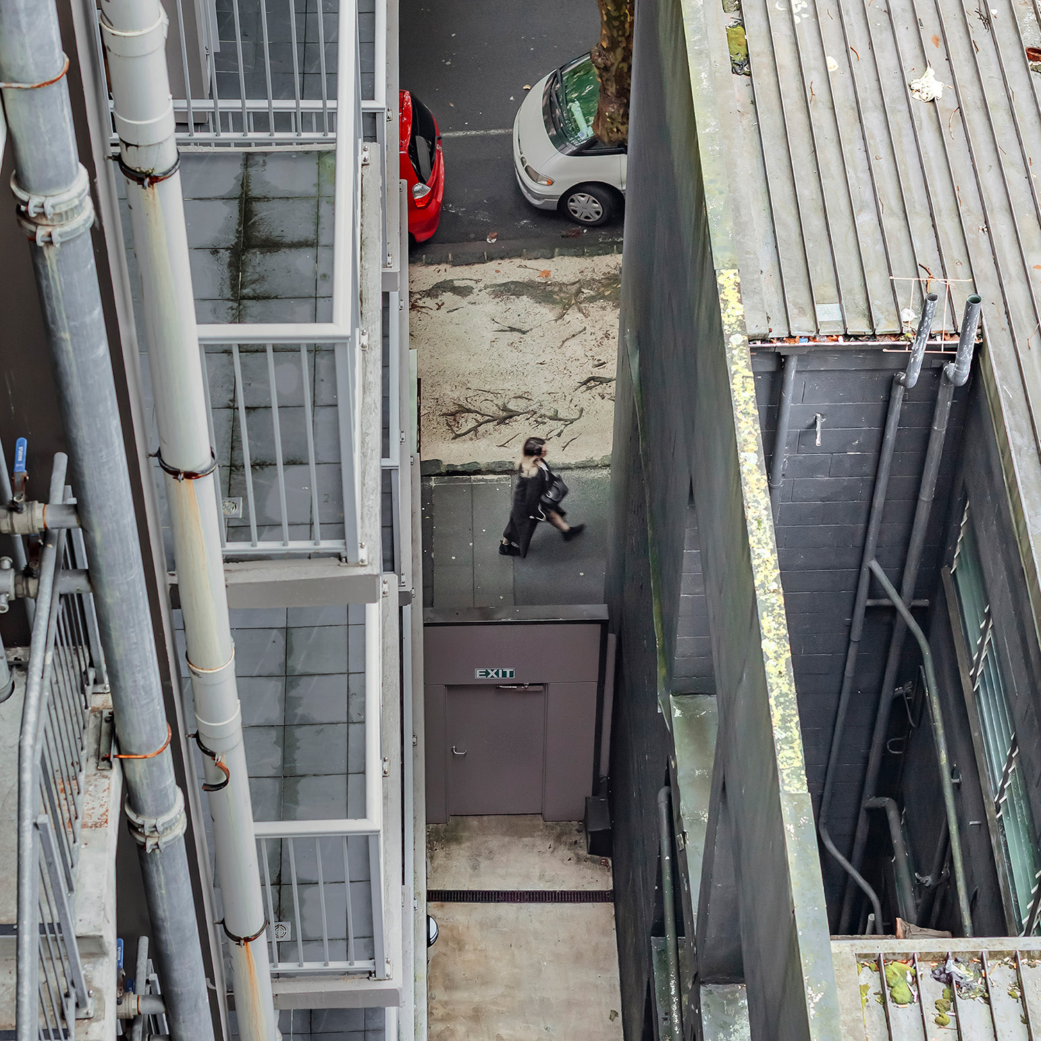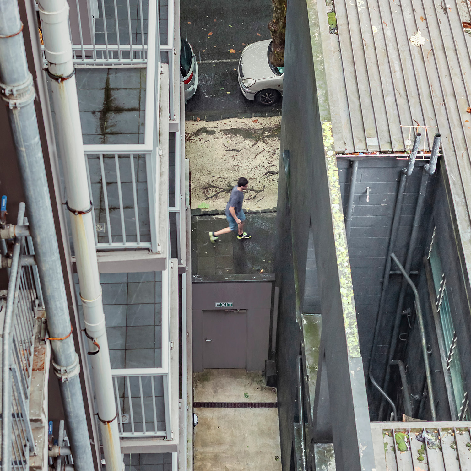 I spent the first month of this three-month break in a studio room of a small apartment in an unfamiliar city. Everything around me felt strange, but it was also exciting and uplifting. During the first week, I spent little time indoors, busy exploring the neighborhood. About two weeks in, I finally began to settle, occasionally sitting blankly on the balcony. It wasn’t a particularly scenic view, but perhaps due to my past work, I had developed the habit of observing the world outside windows. One day, while casually looking around, I noticed a pair of jeans caught in a tree—blown there by the wind. It was a curious sight, not something one sees every day. As I continued to observe and record it, I began noticing people hurrying through the narrow gap between two buildings below. Boredom and the anticipation of seeing who might appear next kept me watching.
