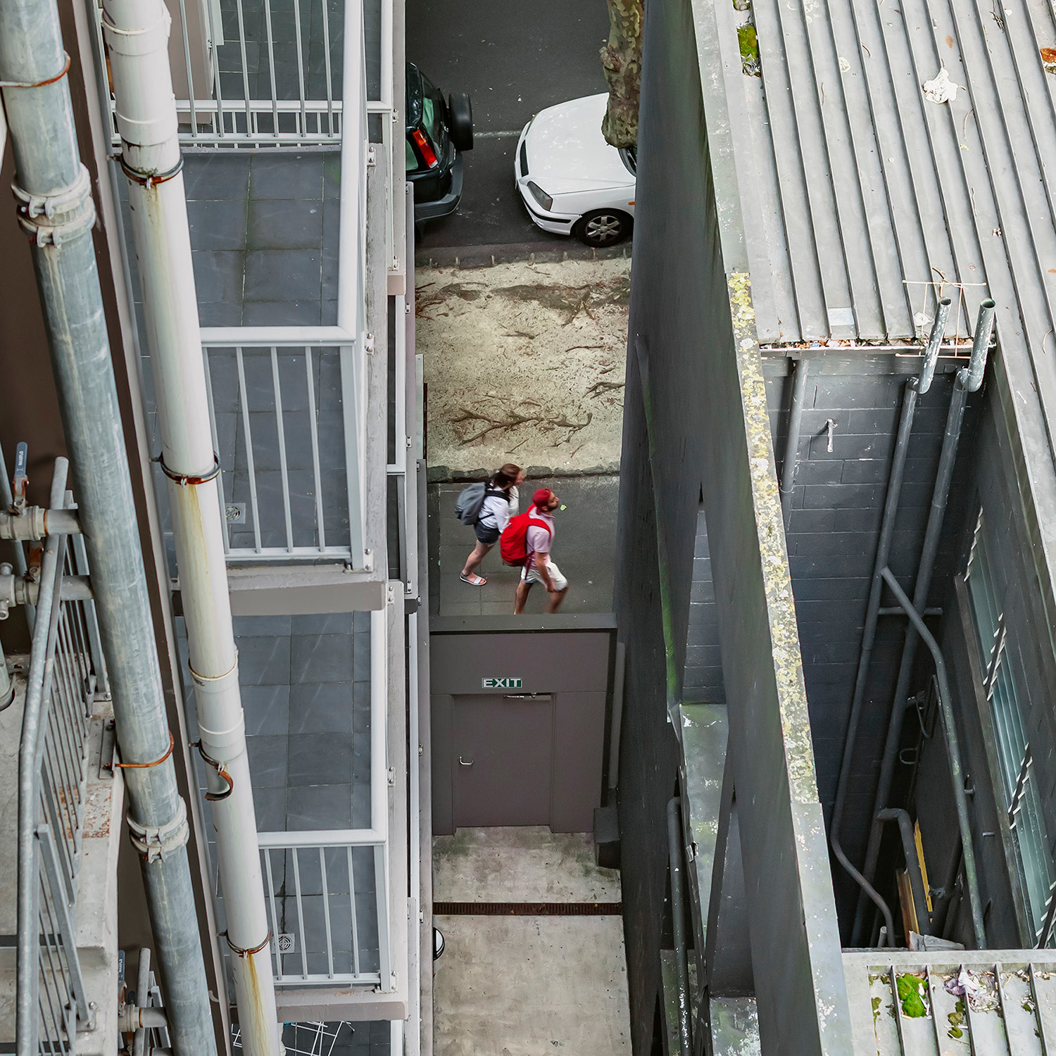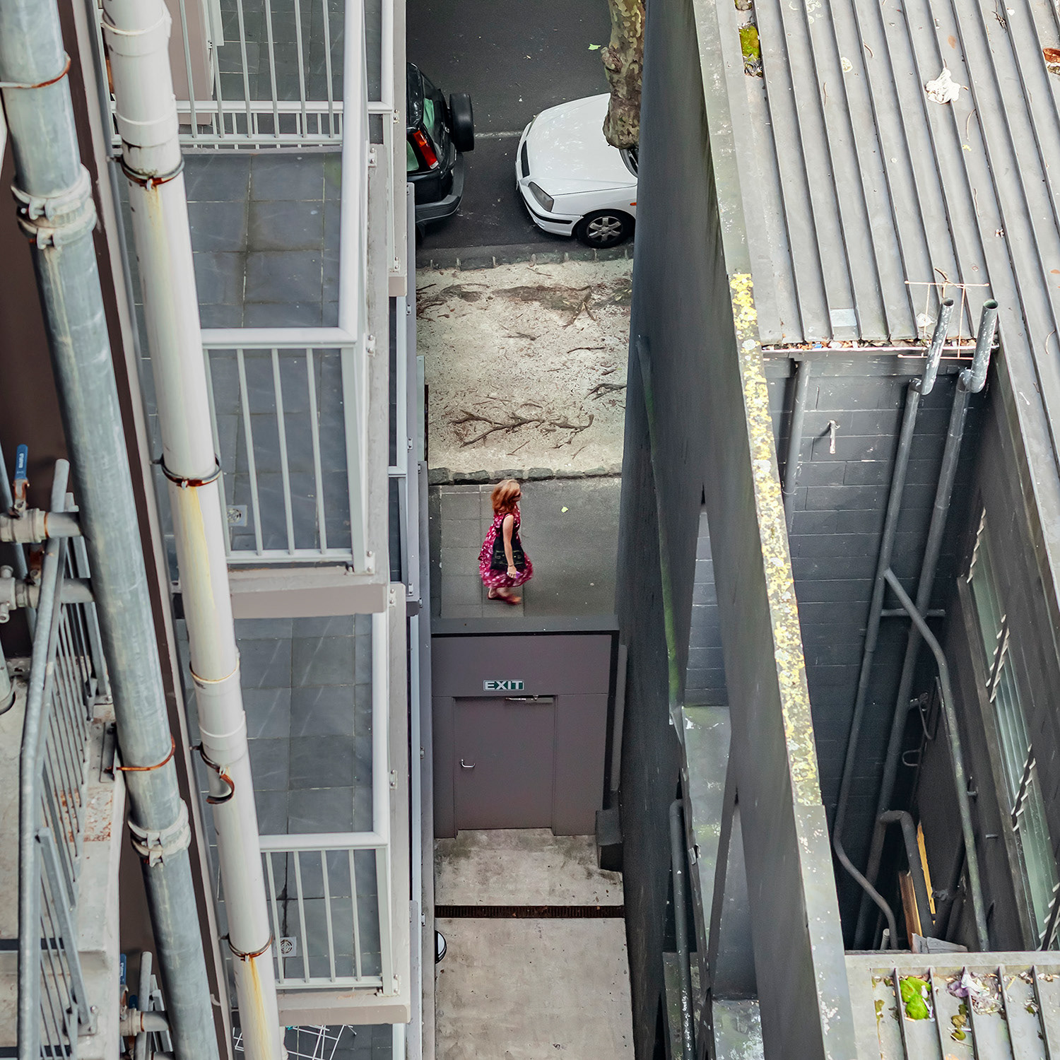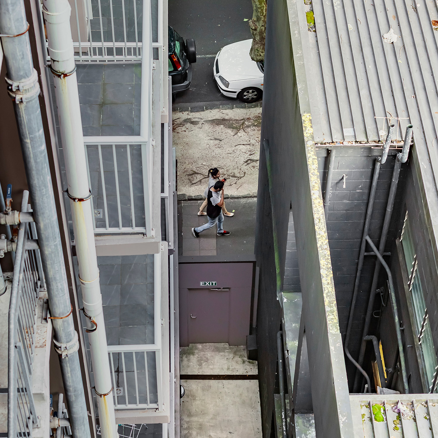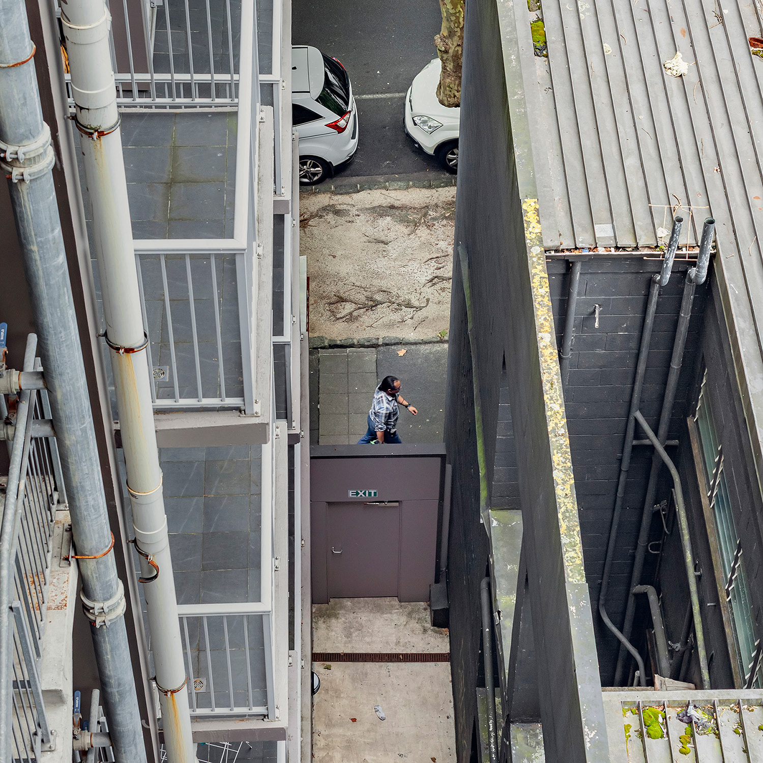 I spent the first month of this three-month break in a studio room of a small apartment in an unfamiliar city. Everything around me felt strange, but it was also exciting and uplifting. During the first week, I spent little time indoors, busy exploring the neighborhood. About two weeks in, I finally began to settle, occasionally sitting blankly on the balcony. It wasn’t a particularly scenic view, but perhaps due to my past work, I had developed the habit of observing the world outside windows. One day, while casually looking around, I noticed a pair of jeans caught in a tree—blown there by the wind. It was a curious sight, not something one sees every day. As I continued to observe and record it, I began noticing people hurrying through the narrow gap between two buildings below. Boredom and the anticipation of seeing who might appear next kept me watching.